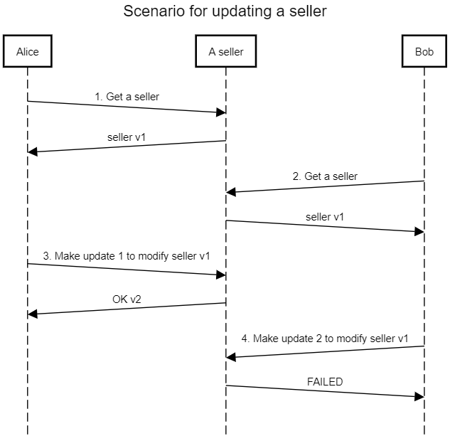 Optimistic concurrency control, on the other hand, permits many users to modify a same resource at a same time. It consists of giving different versions of a resource. The following scenario illustrated clearly this mechanism. Initially, Alice and Bob retrieve the seller version 1, noted as v1. Lately, Alice makes a change to this seller, this update is accepted by the server and noted as version v2, as there hasn't been any change on this data till now. When Bob makes a change on this data, the server will report failure because this change was made on an old version of the data. A simple solution for Bob is to retrieve the new version of the resource before doing his changes.