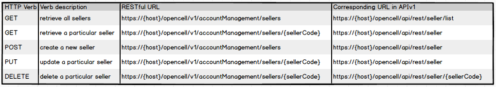 The request must follow a predefined standard. In this section, we show the standard format for different requests. The available requests in APIv1 are numerous (more than 450). In the table below, we take as illustration 5 requests that permit to manipulate the entity Seller.