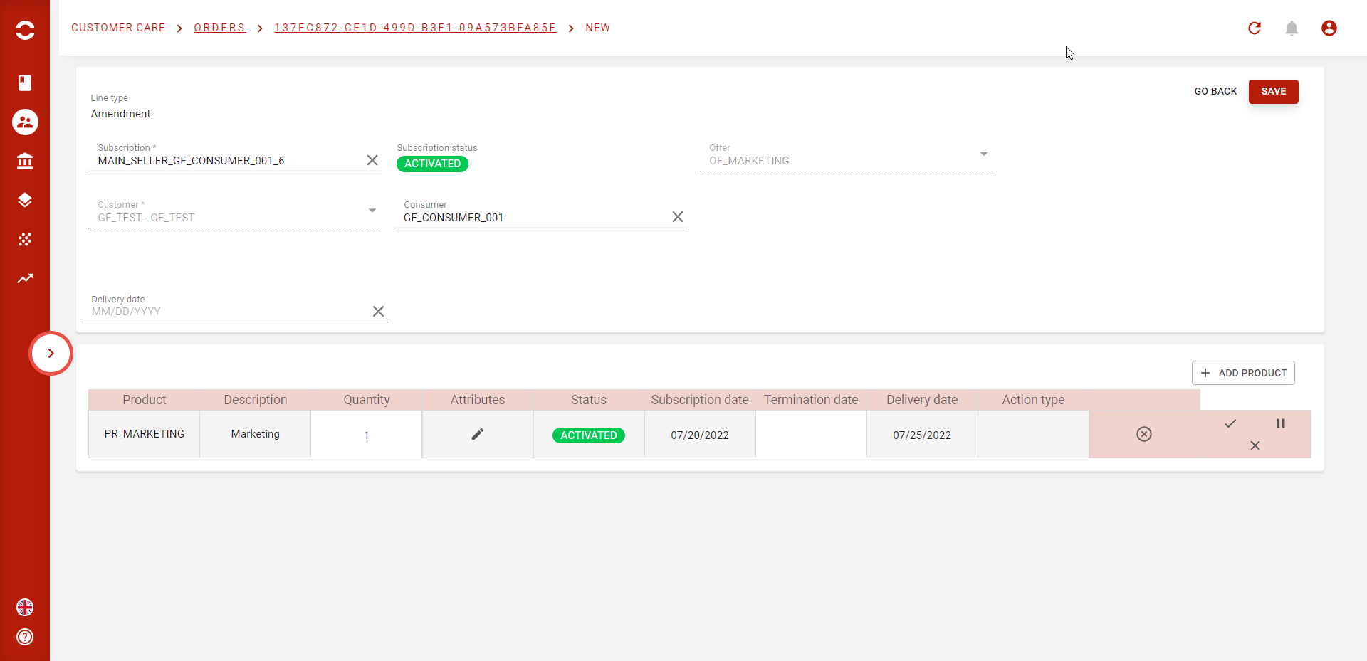 Adding a line of type “AMENDEMENT” will allow you to modify an existing subscription linked to a customer.