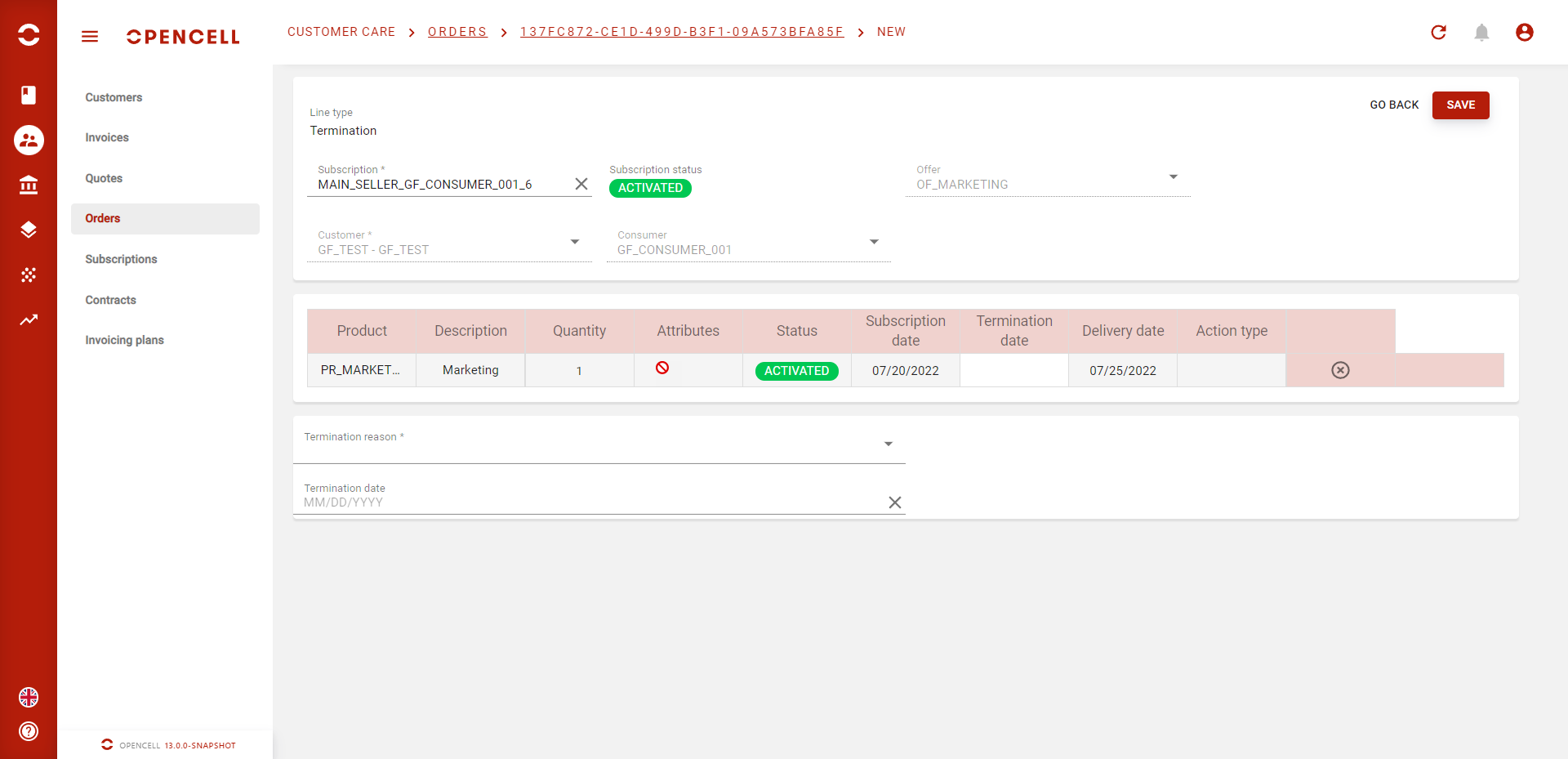 Adding a line of type “TERMINATION” will allow you to plan the termination of an existing subscription linked to a customer.