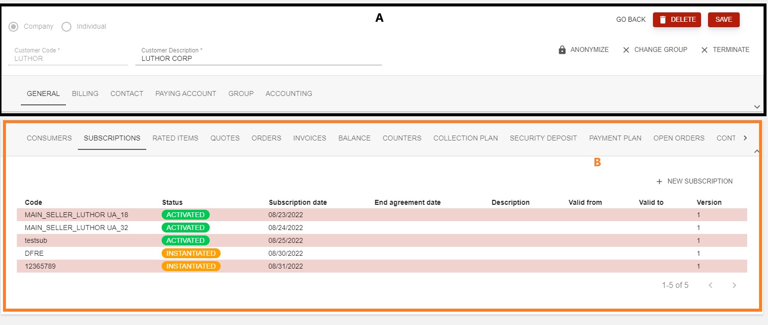 The 360° customer view aggregates all the information on the customer that exists throughout the portal, going from quotes, to subscription, down to the customer’s balance and it’s possible collection plans. You are able to create new entries in most tabs of the 360 view, like quotes, subscriptions, invoices…