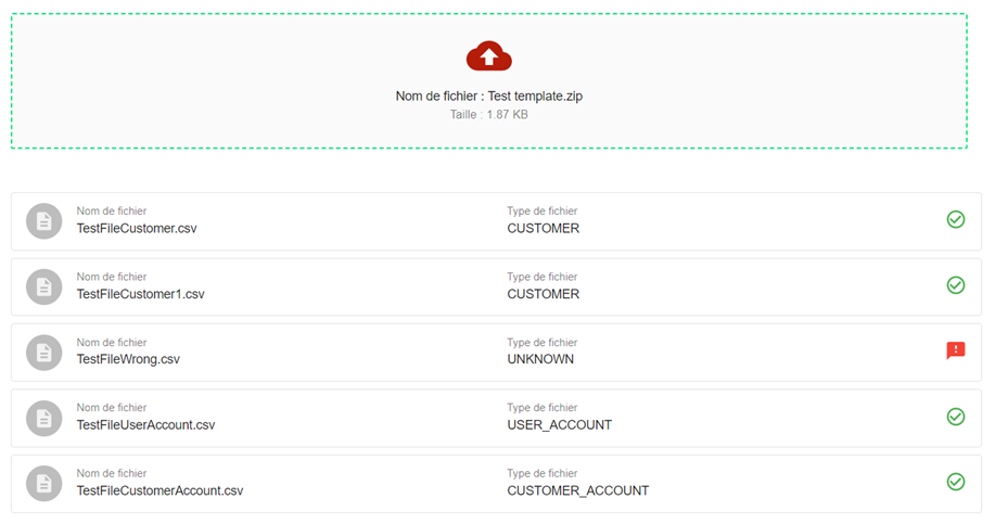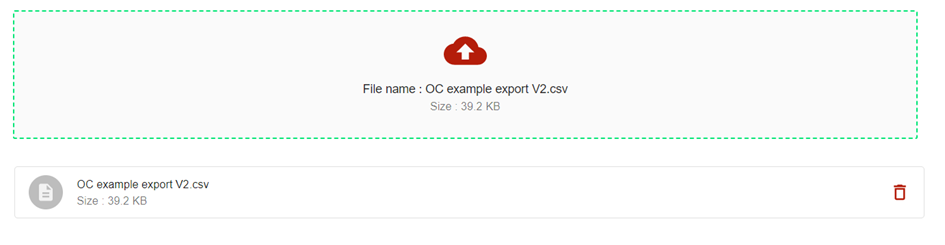 A drag and drop that allows the upload of the file to be imported: accepted zip and csv format