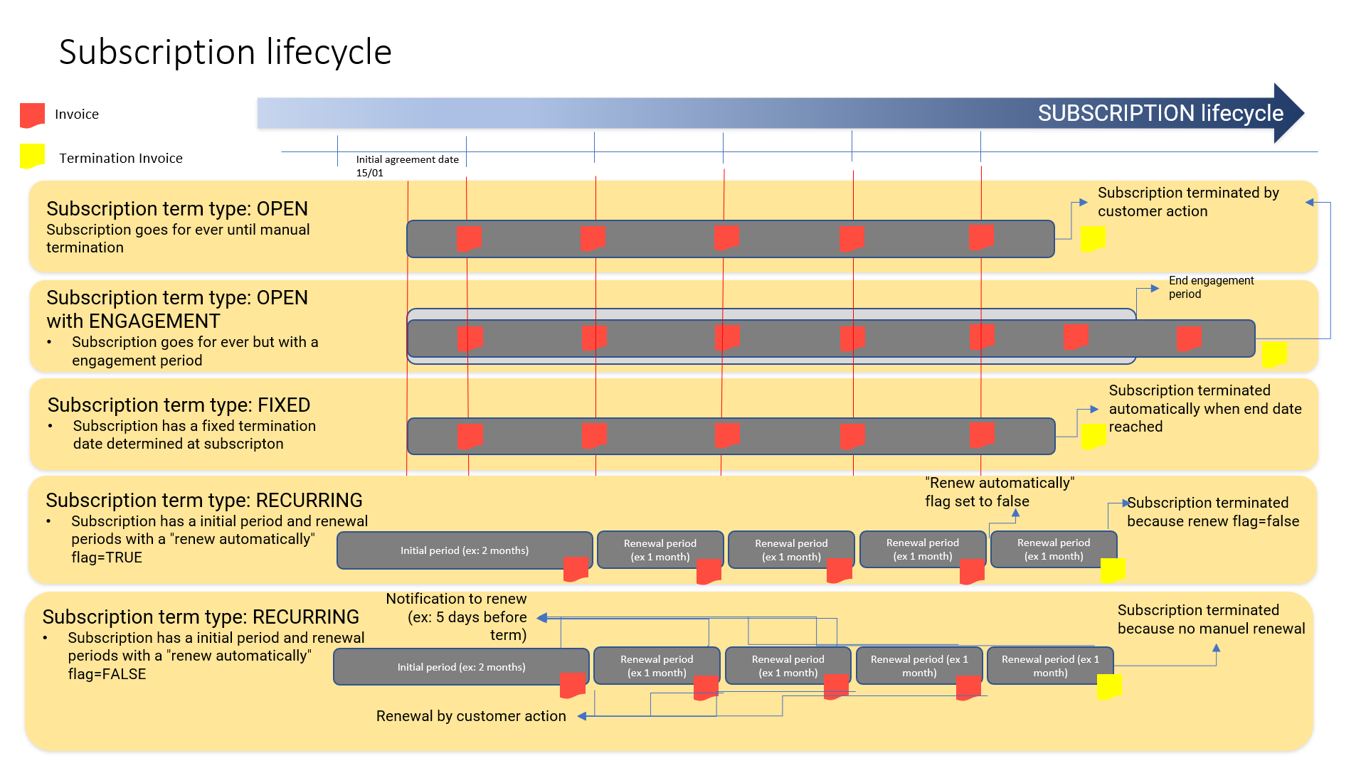 Canceled: The subscription has been created, then canceled, It could be canceled on a specific date and for a specific reason “Termination reason”.