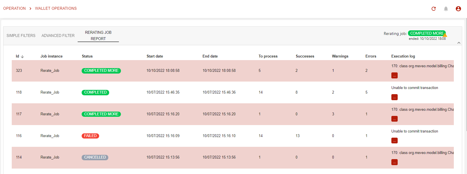 The Rerating Job Report will display the status, and will allow individual WO rerating.